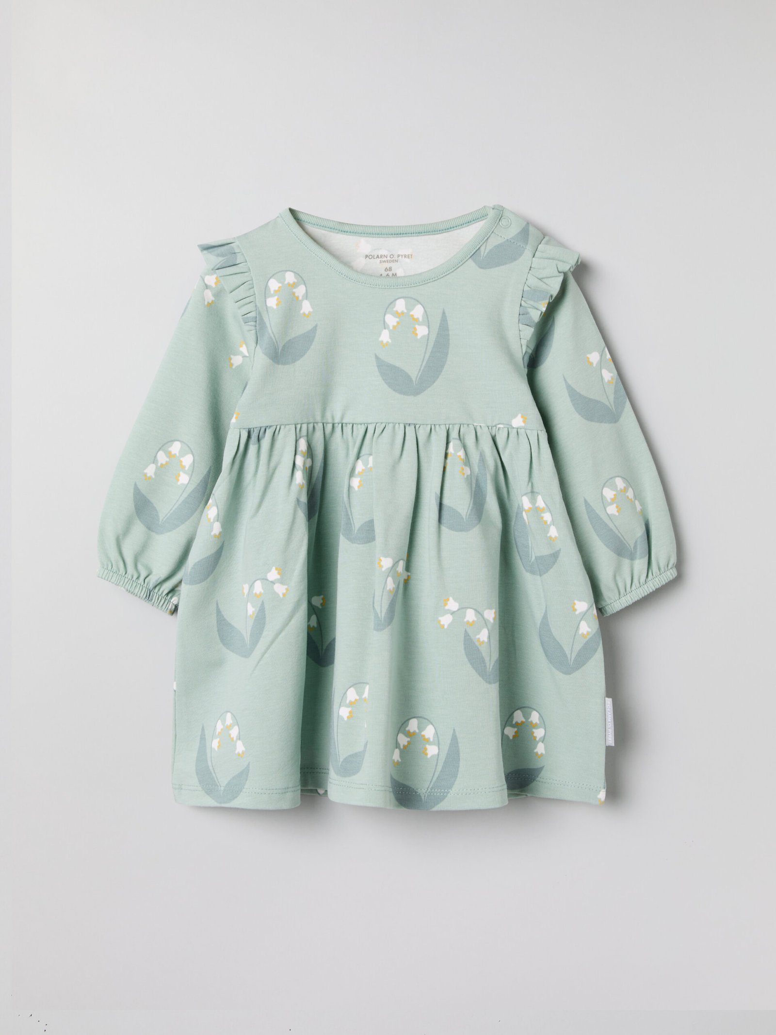 Suloinen mekko pehmeää luomupuuvillatrikoota. Mekko on kuvioitu kokonaan kukkakuviolla. Olkapäillä röyhelöt.