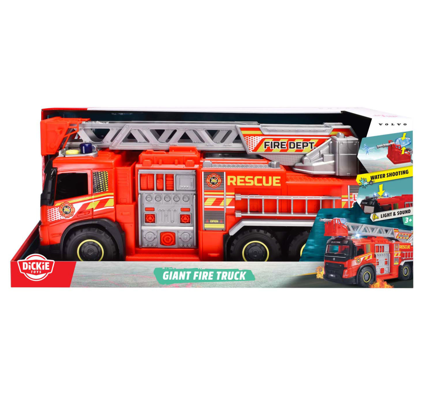 Suuri paloauto, jossa on valo- ja äänitehosteet! Katossa olevan napin painallus saa paloauton vilkkumaan ja soimaan. Tikkaat voi nostaa, pidentää ja kääntää, ja takana sekä päällä on avattavia luukkuja. Autossa on manuaalinen vesipumppu, joka voi suihkuttaa oikeaa vettä – mukana tulee kaksi vesisäiliötä. Mitat: noin 56 × 17 × 24 cmParistot: 2 × 1,5 V AA (sisältyvät pakkaukseen)Ei suositella alle 3-vuotiaille.