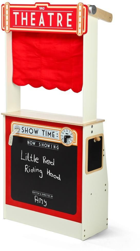 Täydellinen mielikuvituksellisiin teatteri- ja kauppaleikkeihin. Voit esimerkiksi myydä lippuja illan suureen esitykseen lippuluukulta, pistää pystyyn nukketeatterin tai käydä kauppaa kääntöpuolen hyllyiltä. Voit rullata punaisen esiripun piiloon ja avata toiselle puolelle siniraidallisen torimarkiisin