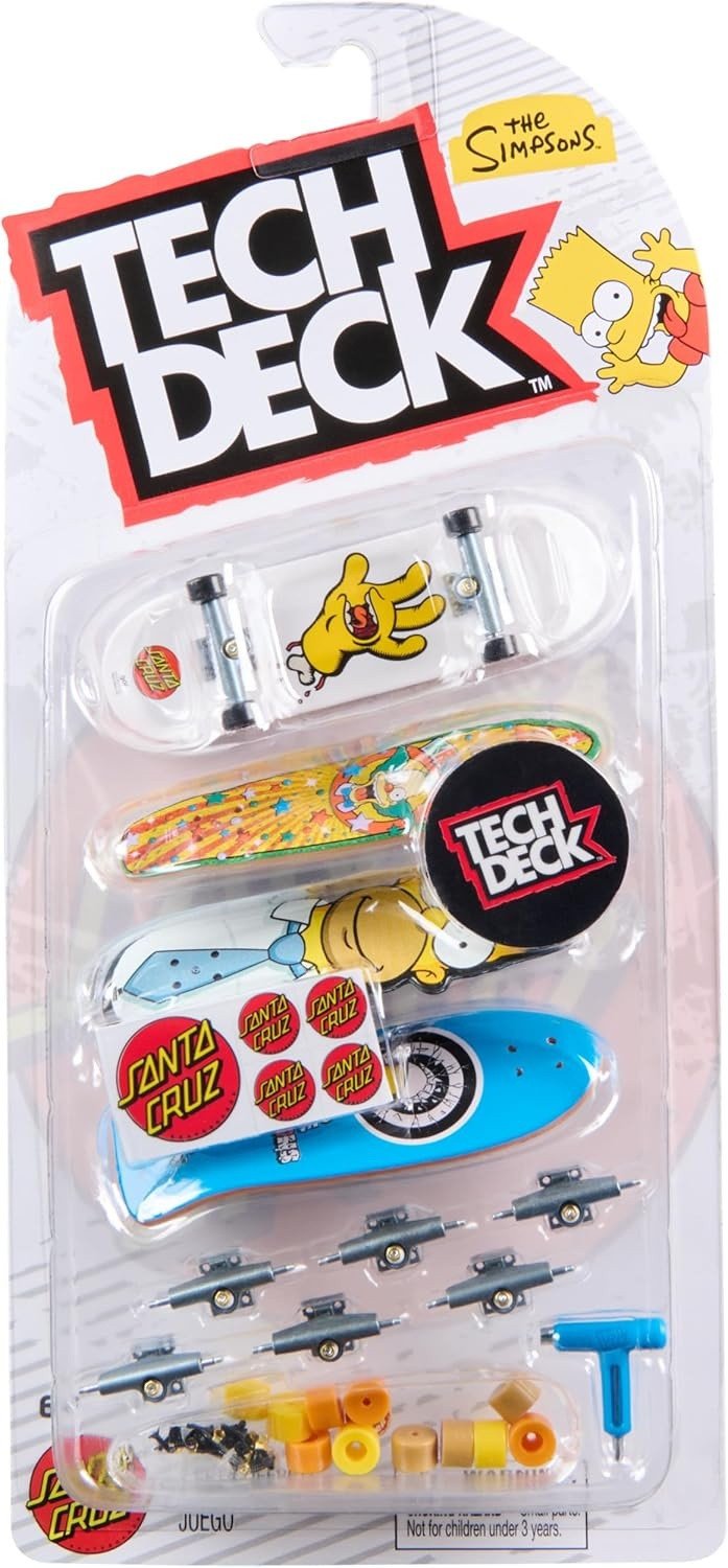 Tech Deck -monipakkaus, jossa neljän sormen rullalautaa. Santa Cruz Simpsonit-painatuksella.