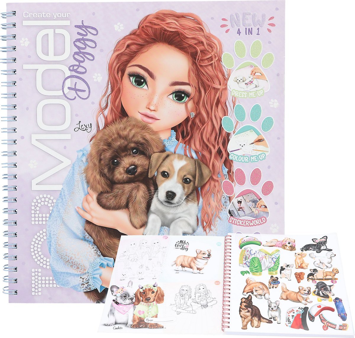 Hau, mahtavaa! TOPModelin luovassa kirjassa ”Doggy” on yli 40 spiraaliin sidottua sivua, jotka ovat täynnä kaikkea ihanaa karvakuonoista. Kirja sisältää väritystehtäviä, täytettäviä kohtia ja tarroja. Mukana on 5 tarra-arkkia.