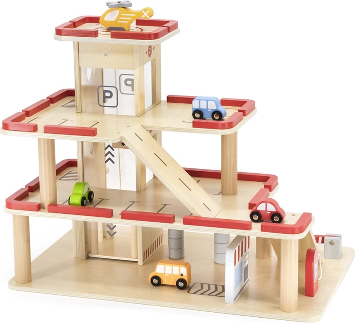 Puinen parkkitalo monilla toiminnoilla Tässä monikerroksisessa puisessa parkkitalossa riittää tutkittavaa! Talossa on toimiva hissi, autopesula ja tankkauspiste. Mukana tulee myös puisia autoja sekä helikopteri, joka voi laskeutua talon katolla olevalle helikopterikentälle. Leikki kehittää lapsen mielikuvitusta ja motoriikkaa, ja tarjoaa monipuolisia leikkihetkiä tuntikausiksi. Sisältää: Parkkitalo, hissi, pesu- ja tankkauspiste, autoja ja helikopteri Mitat: 58 x 37 x 46 cm Ikäsuositus: 3 vuotta +