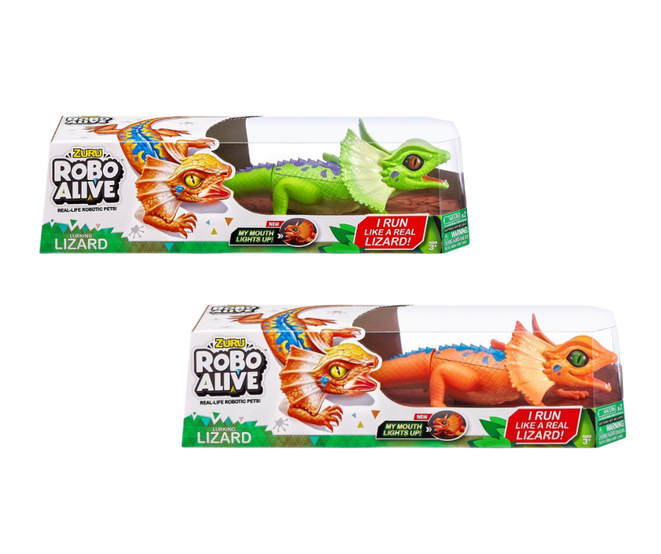 Robo Alive Robotic LizardVie leikit uudelle tasolle tämän vauhdikkaan Robo Alive -robottiliskon kanssa! Se liikkuu salamannopeasti kuin oikea lisko, ja sen realistiset silmät sekä liikkuvat raajat tuovat leikkiin lisää jännitystä. Pehmeästä kumista valmistetut pää ja häntä tuntuvat lähes aidolta. Saatavilla vihreänä tai oranssina, otamme toiveita vastaan mutta emme valitettavasti voi taata saatavuutta. Pakkaus sisältää: 1 robottilisko ja käyttöohjeet. Paristot eivät sisälly pakkaukseen. Ikäsuositus: 3+.